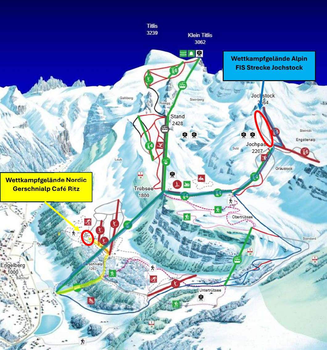 Alpin-Wettkämpfe (blau): Gondelbahn ab Engelberg bis Trübsee, Verbindungssessellift Trübsee-Hopper zum Jochpass, Sessellift Jochpass, Sessellift Jochstock, der Start GS befindet sich ca. 100 m unterhalb der Bergstation Sessellift Jochstock, Zielgelände unmittelbar vor dem Berggasthaus Jochhütte.